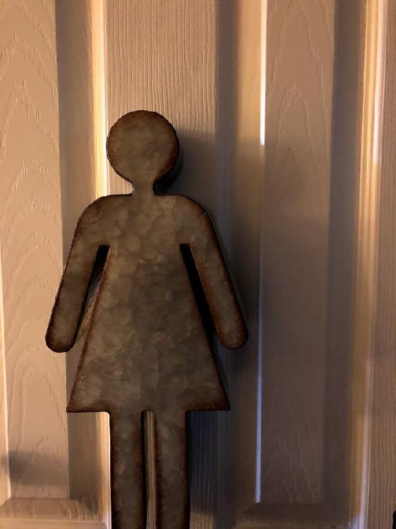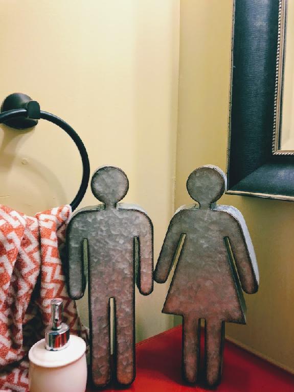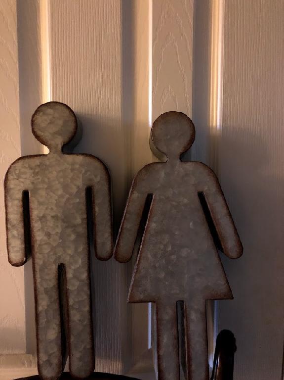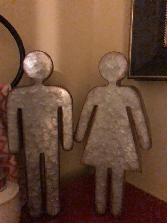 A-0019Set of 2 (male & female) 3 dimensional rustic galvanized signs. You can hang it on the Bathroom/RestRoom door or keep inside and give a new look to your bathroom.14" tall x 5.25 wide x 2" deep. Good for both INDOOR & OUTDOOR use!