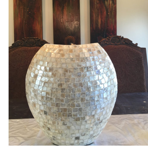 Add an exotic touch to your living room or entryway with this this handcrafted leaf shaped vase with hundreds of iridescent capiz shells over a sturdy base. Filled with dried florals or not, it’s really Stunning•Ivory•17.50"H x 6.50"D Sold Out