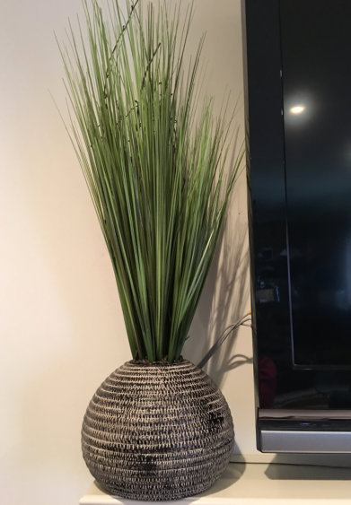 Living room/or bedroom $85Beautiful Blakish&Gray vase with long grass which you can use in living room and dinning room to give some natural feeling to the room.Set of two with grassMeasure 8”H of the vase with grass 31”H